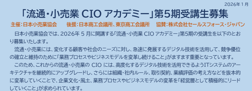 日本小売業協会では「流通・小売業CIOアカデミー」が開催されています。
