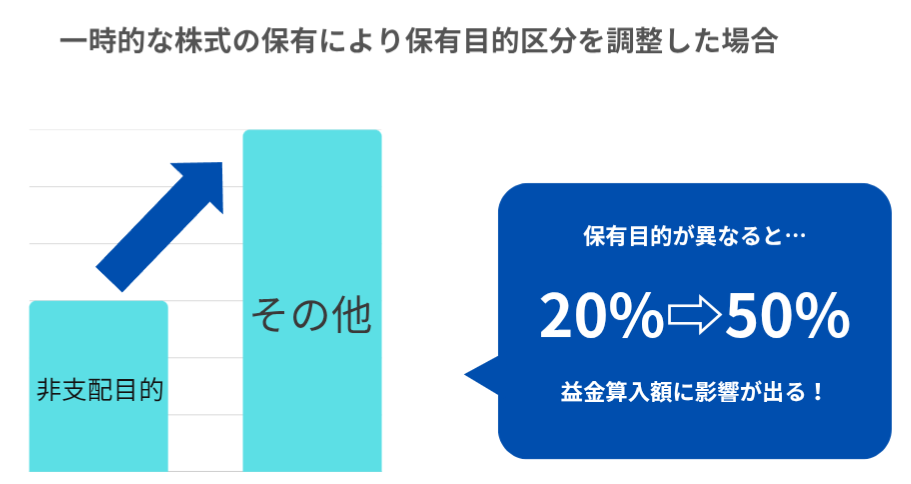 一時的に5%を超える株式を保有して、基準日直後に売却をすることにより、「非支配目的⇒その他」に区分が変動します。